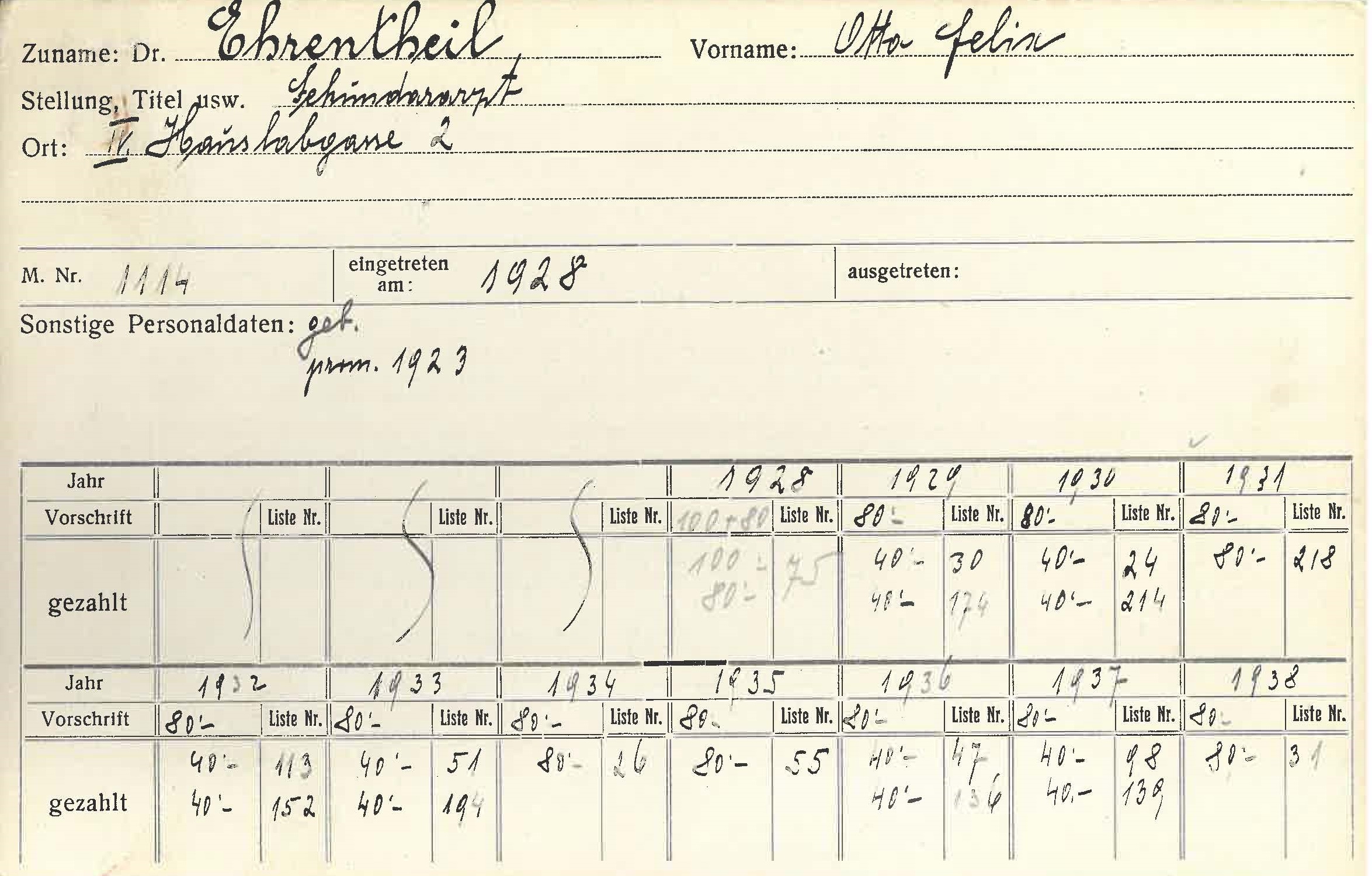 Ehrentheil hielt folgende Vorträge in der Gesellschaft der Ärzte in Wien: (mit G. Kopstein) Über Entstehung eines spontanen Pneumothorax in einem Fall von artifiziellem Pneumothorax (19. 6.1931), (mit F. G. Back) Ein von außen lenkbarer Gastrophotographieapparat (24.2.1933), (mit F. G. Back und E. Suchanek) Ein Apparat für Kehlkopfphotographie (17.10.1930).